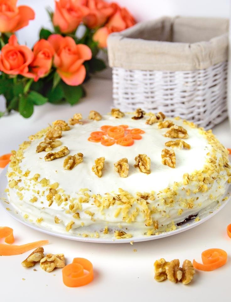 This cake has a classic cream cheese frosting and it's garnished with chopped walnuts and shaved carrots. Would you like a slice of this carrot cake?