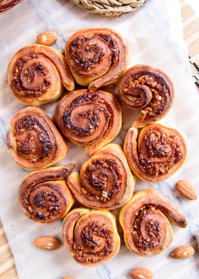 These fluffy and light yeasted dough rolls are filled with a sweet buttery almond, vanilla and cinnamon filling. Originally they are filled with ground walnuts, but in lack of walnuts, I replaced them with ground almond.