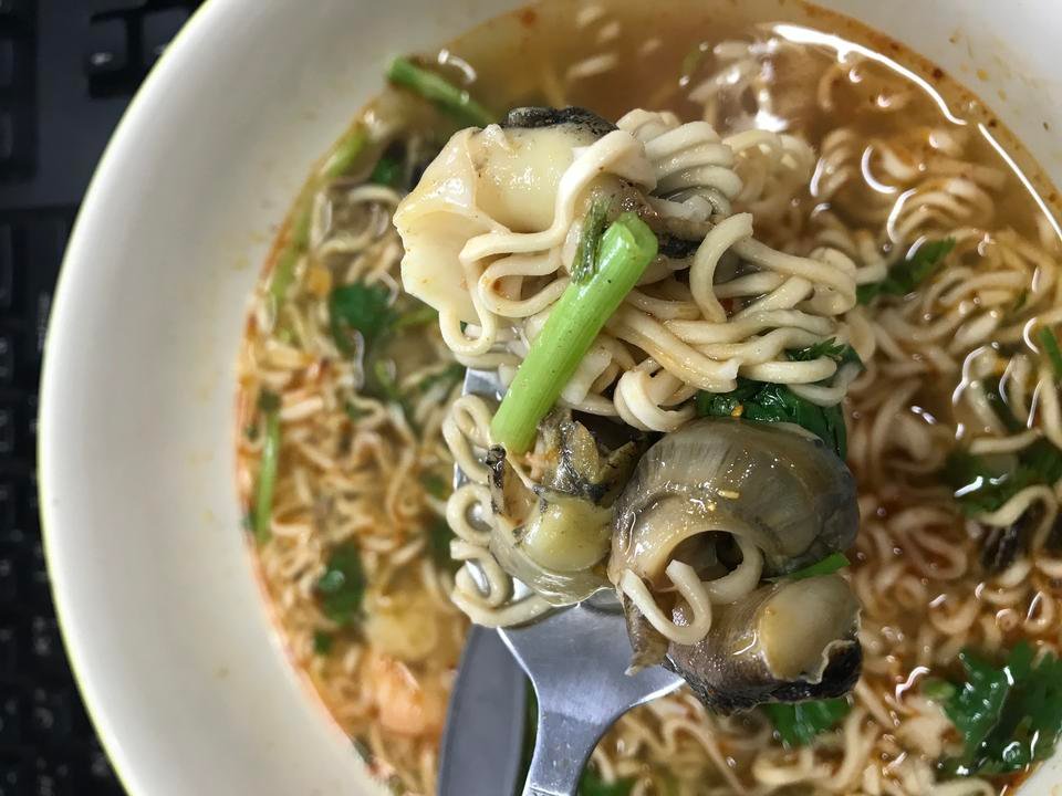 ดึกแล้วก็ยังหิวก็เลยตามใจปากสักหน่อย เปิดตู้เย็นดูหน่อยสิพอมีอะไรทำกินได้บ้าง เห็นมีกุ้งย่าง 6 ตัว หอยหวาน 3 ตัว หอยแมลงภู่ 5 ตัว อารมื้อเที่ยงที่กินไม่หมดเหลือก็เลยเก็บไว้ ส่วนมากผมกินอาการทะเลไม่ค่อยอยู่ท้องเท่าไหร่ แปบๆ ก็หิวอีกแหละอะไรประมาณนี้ วันนี้พัทยาฝนตกตอนดึกอีก ตอนนี้ก็ยังตกอยู่ เวลา 00:07 มีมาม่าต้มยำกุ้ง 1 ซอง คิดขึ้นได้ต้มมาม่าใส่ กุ้งหอยทั้งหมดนี้แหละ ใส่ผักชีลงไปด้วยหอมๆ