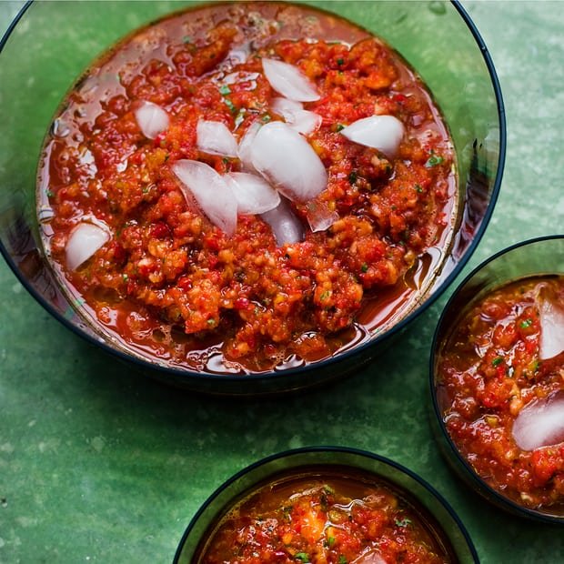 A light, bright-tasting soup to serve chilled. By which I mean thoroughly cold, and served with ice cubes. The consistency can be as smooth or rough as you like, but I prefer it to have a coarse minced texture, so use the mincer attachment to the food mixer. I have used a food processor too, but it requires keeping a careful eye not to reduce it to a puree.