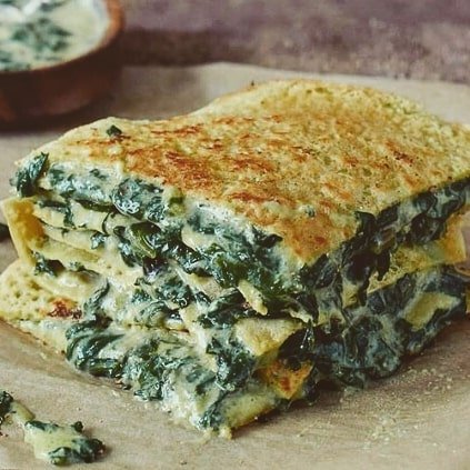 The filling is just cooked baby spinach with easy vegan cheese sauce and different spices.