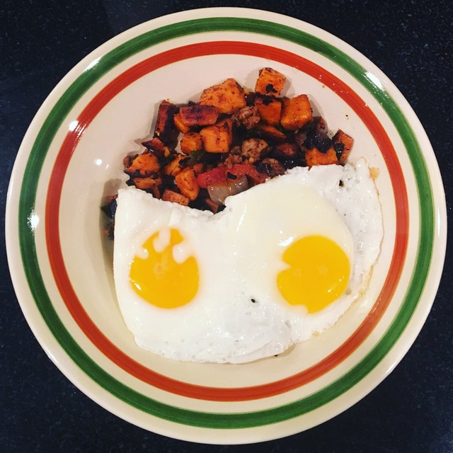 Continue to stir fry until sweet potatoes appear to brown (5-8 minutes). Add Tabasco (about a tablespoon for me, but I like it spicy!). Take 1/4 cup of water drop in pot while on high and cover with lid let sit for 5-8 minutes. In a separate pan begin heating the eggs. I recommend over easy for the doneness.