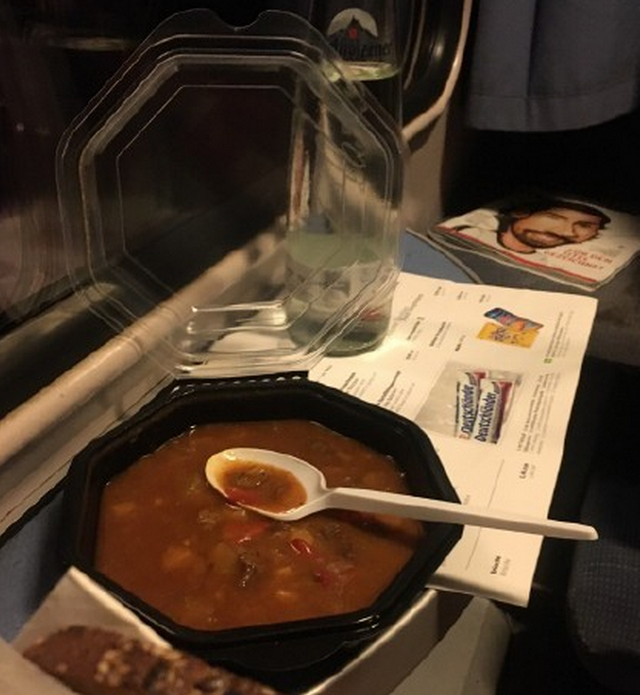 This is a train meal on the German high-speed rail. The main food is two pieces of bread, which is a soup cooked by beef, carrot, potatoes and green vegetables. The material is still enough, but the smell is not flattering, and this one is 8 euro, which is equivalent to more than 60 yuan.