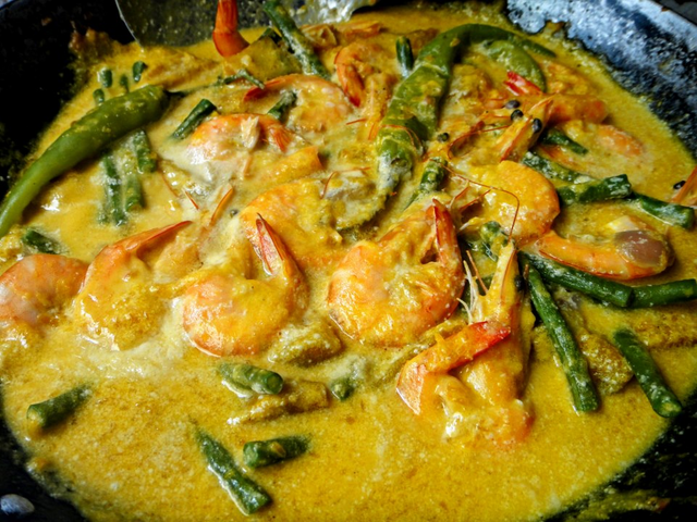 Once the string beans becomes soft, add the coconut milk and shrimp.