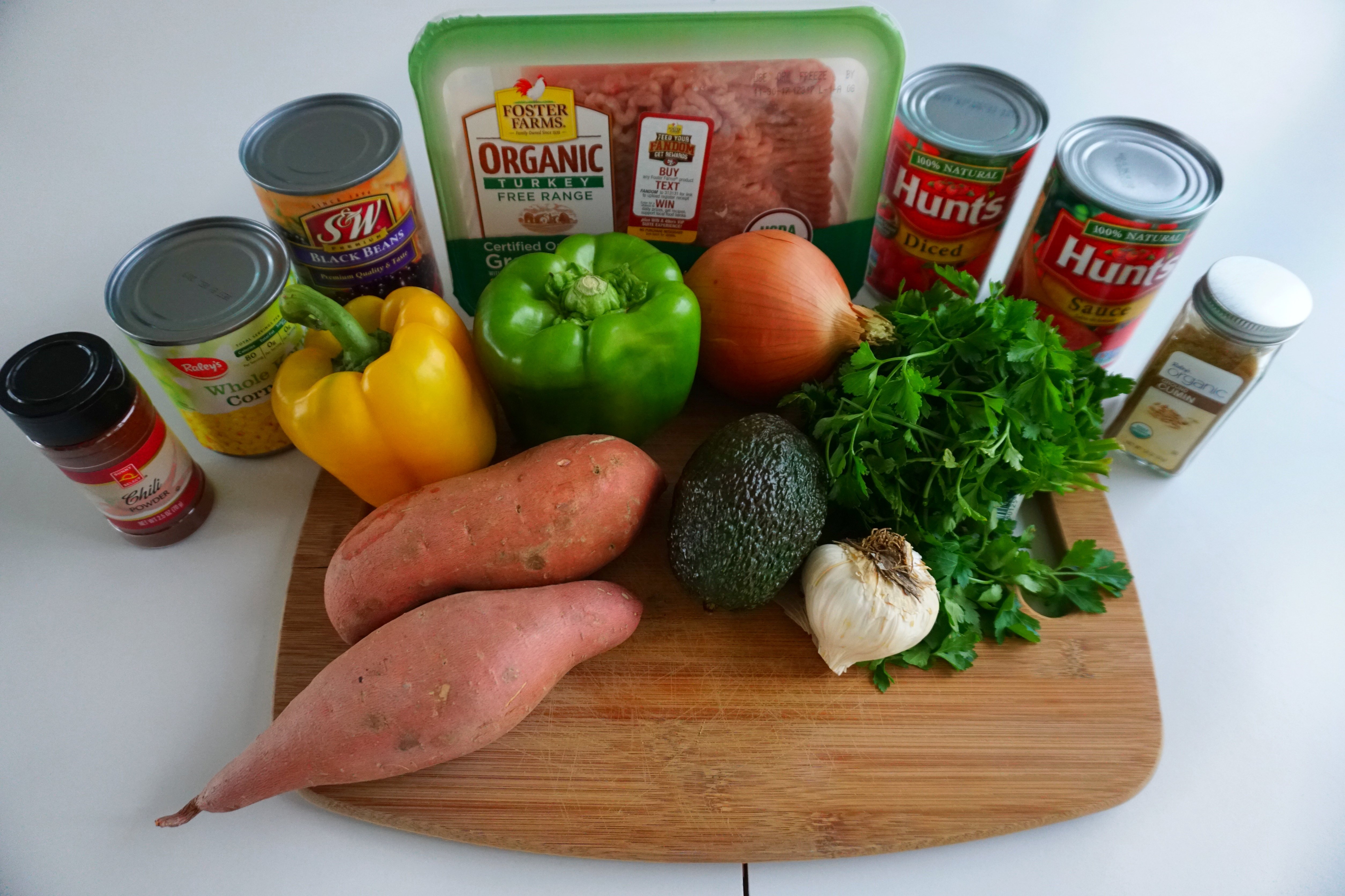 Stir beans, corn, tomatoes, sauce, cumin, chili powder, and browned turkey into sweet potato mixture. Stir over medium-high heat until chili is heated through and the sweet potatoes can be pierced with a fork.