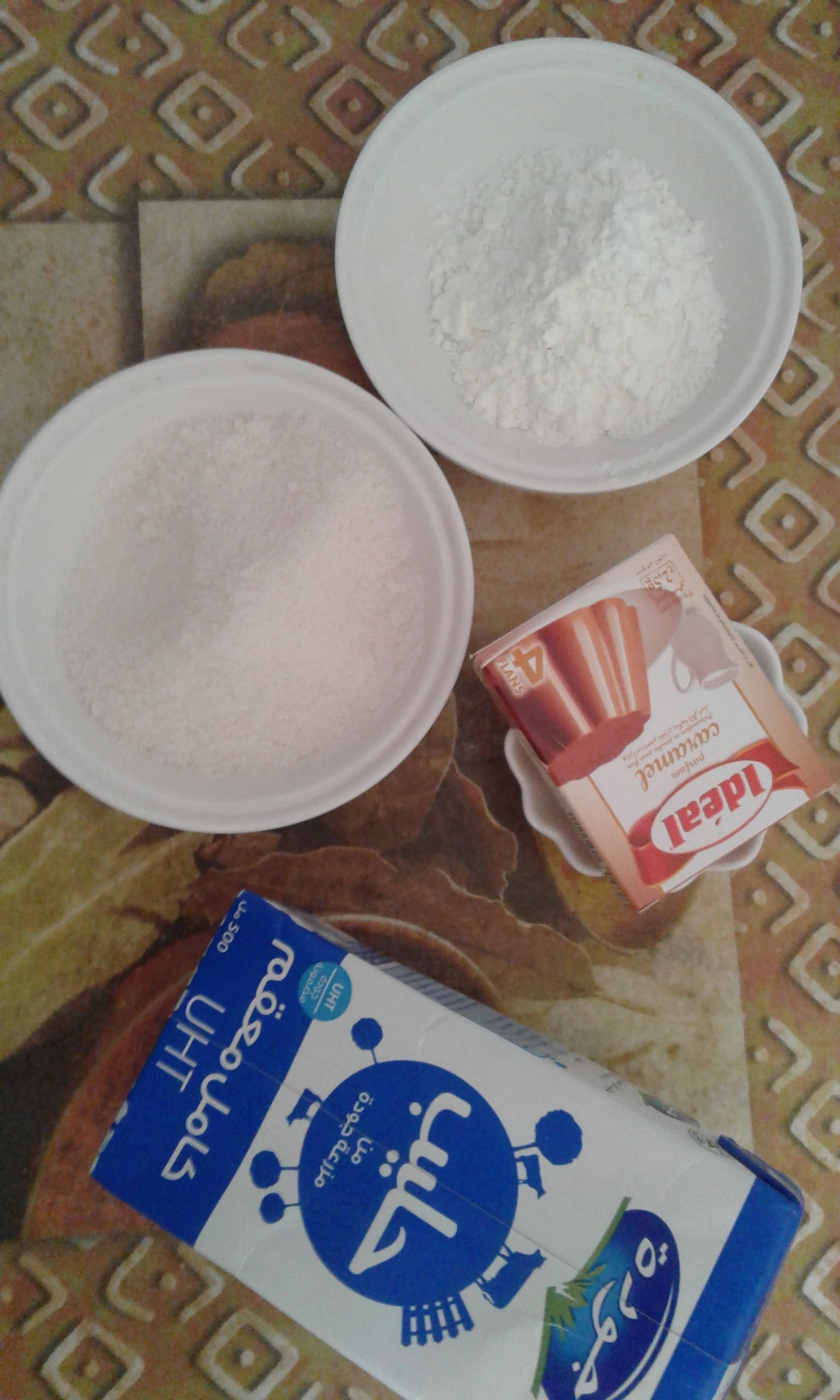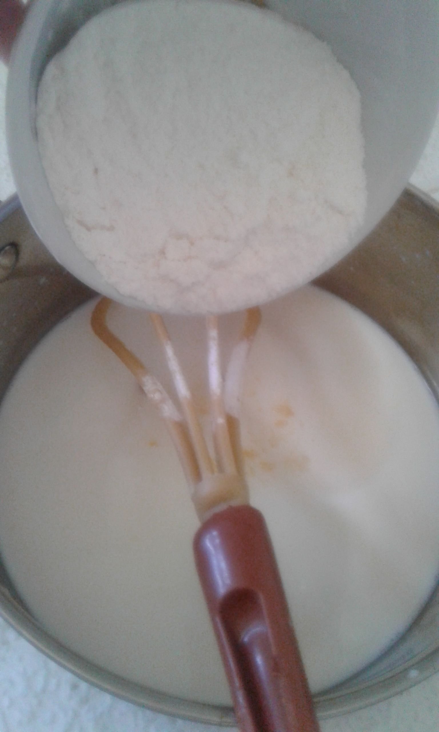 ناخد إناء ونصب فيه كل من بودرة الكريمة وسكر الخشن وكيس لفلون كرميل نخلطهم جيدا كي لا يتحبب عند صب الحليب ،ثم نصب الحليب ونخلط جيدا ثم نضعه فوق نار متوسطة