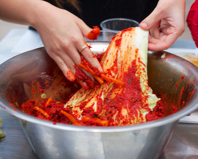 Mix the onion, garlic, ginger and fish sauce into a paste in the food processor. Add the cooled rice flour and stir in the red pepper flakes. Stir well and add the julienne sliced carrot, spring onion, daikon and leek.