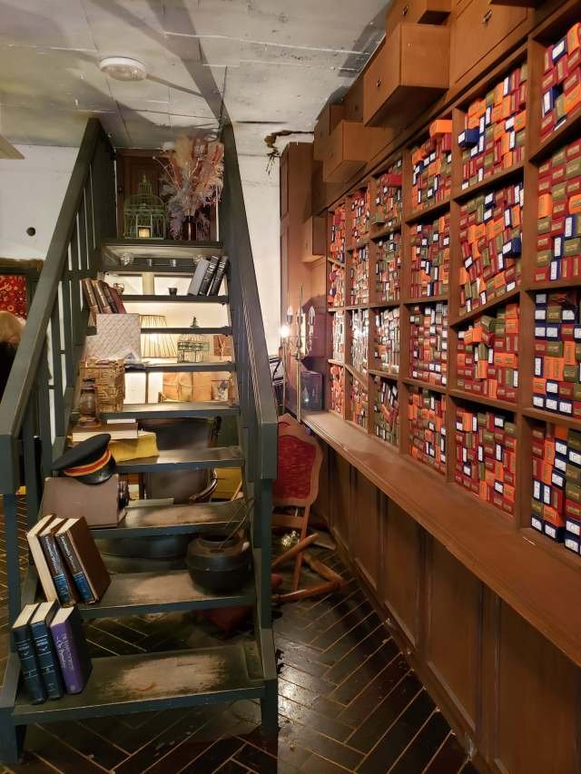 When you first walk in the front door of the cafe, you'll be welcomed by boxes of wands to your right along with some interesting decor on the stairs and behind the stairs.