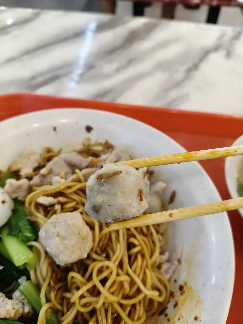 Then the toppings, wow. For something that looks modest, the bowl was loaded, blanched greens for freshness and crunch, two bouncy meatballs, tender pork slices, bits of minced pork, a sprinkle of dried ikan bilis for crunch and seafood flavor, plus fried shallots and tiny garlic bits. It’s a lot of texture in one bowl, chewy, crisp, soft, and crackly, so your mouth never gets bored.