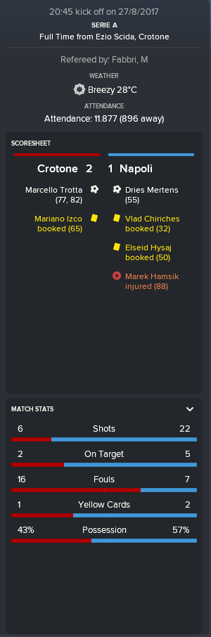 In both matches plan was the same as versus Roma, defend and wait for counter attacks. First home match this season was against Napoli, they were strong favorites. Match in first half was very boring, they were ineptly trying to pass our deeply placed defence. We were defending quite well until 55th minute, when Dries Metrens scored. Then i decide to go 4-2-4 formation. And then... TROTTA SCORED TWO GOALS!!! Entire stadium went mad. After 10 minutes referee has blown the whistle. It was incredible, we defeat Napoli!!!
