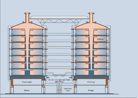 La climatisation étant inexistante, le bâtiment a réduit de 90% sa consommation énergétique par rapport aux centres commerciaux standards.