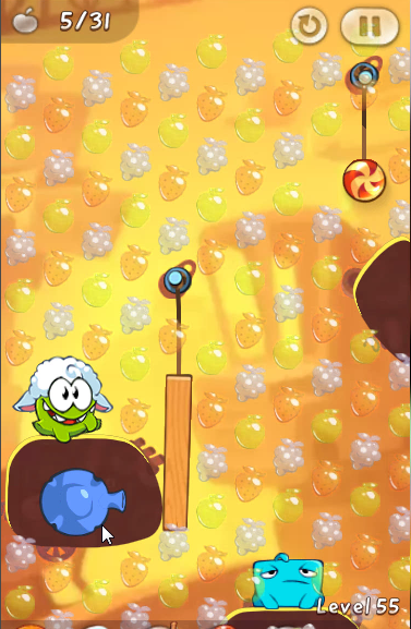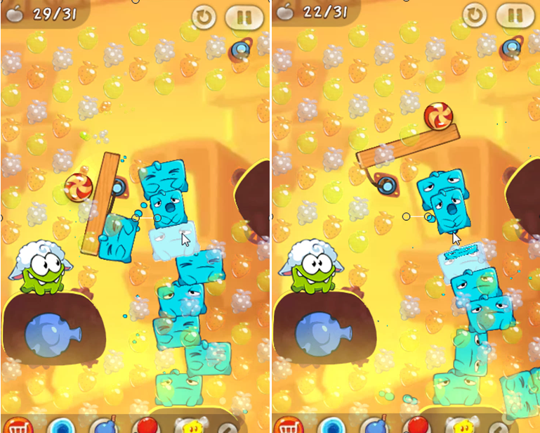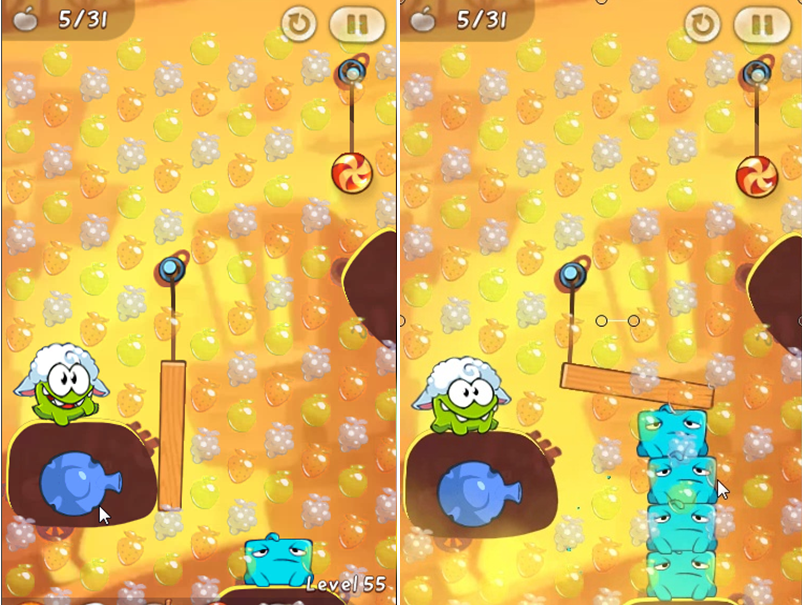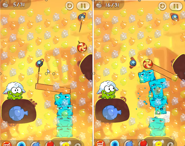 The next step is to cut the rope on the sugar candy to let the candy fall while touching the fruits in the air, and land on a wooden beam and roll over to Om Nom click on Blue to add himself and the candy and wooden beams will go up while touching the fruit. the fruits that are on the top up to several times have to add Blue for higher and take the fruits at the top so that until the target for the mission of this fruit, see picture below: