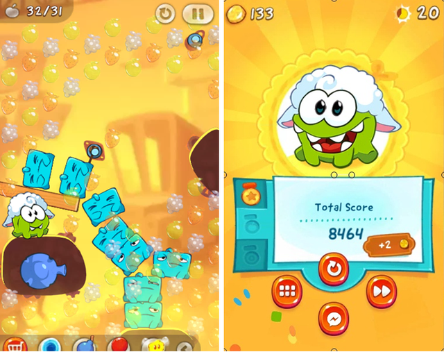 Blue keeps adding himself and falling down and disappearing in the blink of an eye, and he tries hard to add himself when the others fall down, unceasingly he takes out his power so that Om Nom gets the sugar candy to the right, as Blue falls too add ourselves but we must see the position of candy when falling and floating in the air. Sugar candy will touch the fruit that is in the air and the position above Om Nom is, Om Nom immediately opened his mouth and eat this sweet candy sugar.