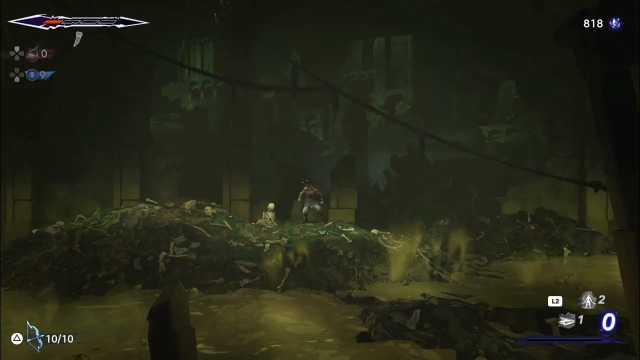 This gigantic SOB though, I only had to do one lunge at him with my dash move to realize that this giant shield he's got going on there prevents any of that warp-behind business. Try it an he whallops you across the room. haha. It became evident to me that I do not possess a particular skill or item that is required to get past it so instead I just ran away, which is something that you frequently have to do in this game. If you try to attack something and nothing is getting through, there is a really good chance that this is must a moving version of the colored doors in Metroid... you can't get past it yet so just wait and maybe come back later.