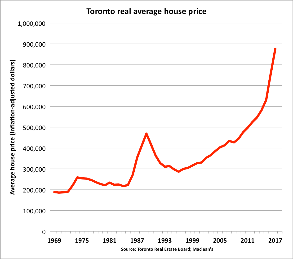 A torontói ingatlanpiac utolsó csökkenése a 90-es évek elején volt, de a 2008-as válságban szinte nem is mentek lefelé a lakás árak, és azóta is csak folyamatosan emelkednek.