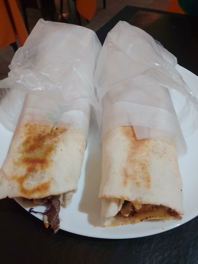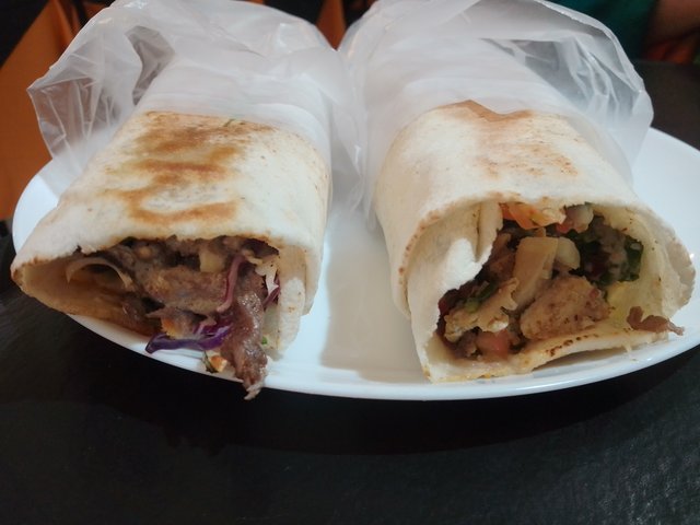 Pedí lo primero que me llamó la atención: shawarmas, los clásicos. Cuando el plato llegó, supe que había tomado la decisión correcta. Frente a mí, dos shawarmas me miraban como si compitieran por mi atención. El de la izquierda, con su carne jugosa asomando entre hojas de repollo morado y una salsa cremosa que prometía intensidad; el de la derecha, con trozos de pollo dorado, tomate fresco y ese perfume de especias que me hizo cerrar los ojos apenas lo sentí.