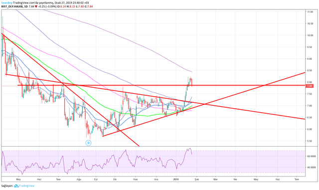 Son haftada daha da yoğun olarak hissedilen Bist 100'ün rüzgarını da arkasına alan Halkbank hisse (HALKB) senedi, önemli bir noktadan geri dönüş gerçekleştirdi ve 7.86 direnç bandını destek görerek bir geri çekilme yaşadı. Özellikle bu nokta aşağı yönde kırılırsa yeni hedef üçgen farmasyonunun olduğu kısım olacaktır. Yatırımcıların bu noktada dikkatli olmasında fayda var.