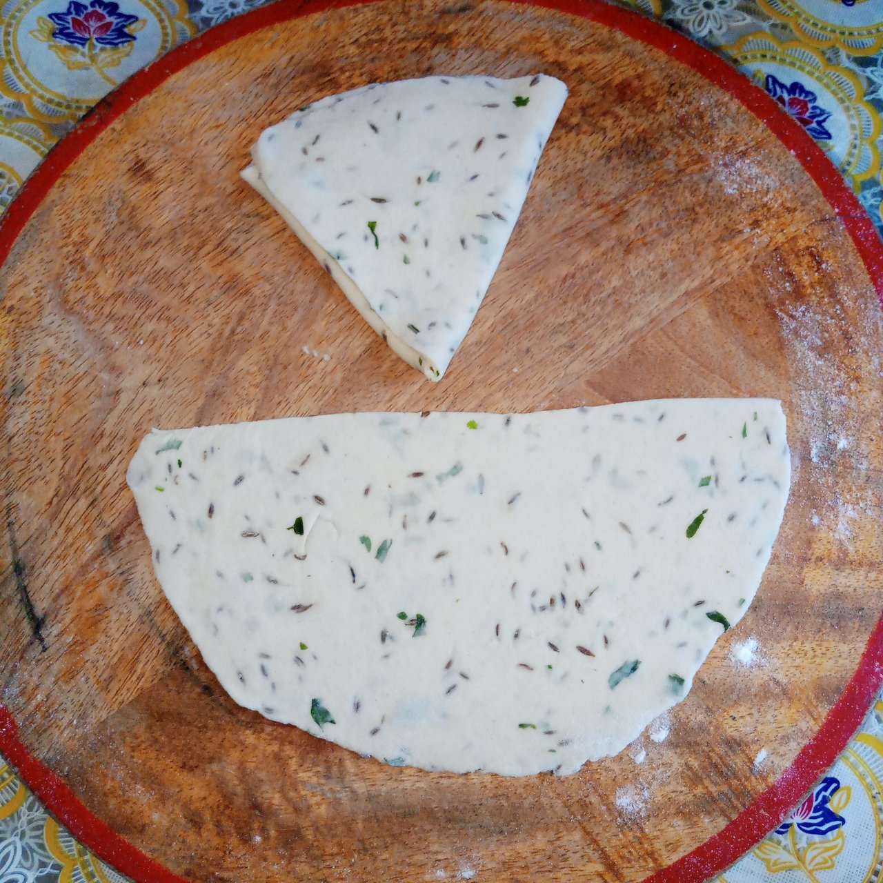 It had been a long time since I had kept the dough. The dough was very well prepared. After which I made small round balls of it. Then I took a round piece of dough and rolled it out thinly, like bread on a rolling pin. Then I cut it into two pieces with the help of a knife.