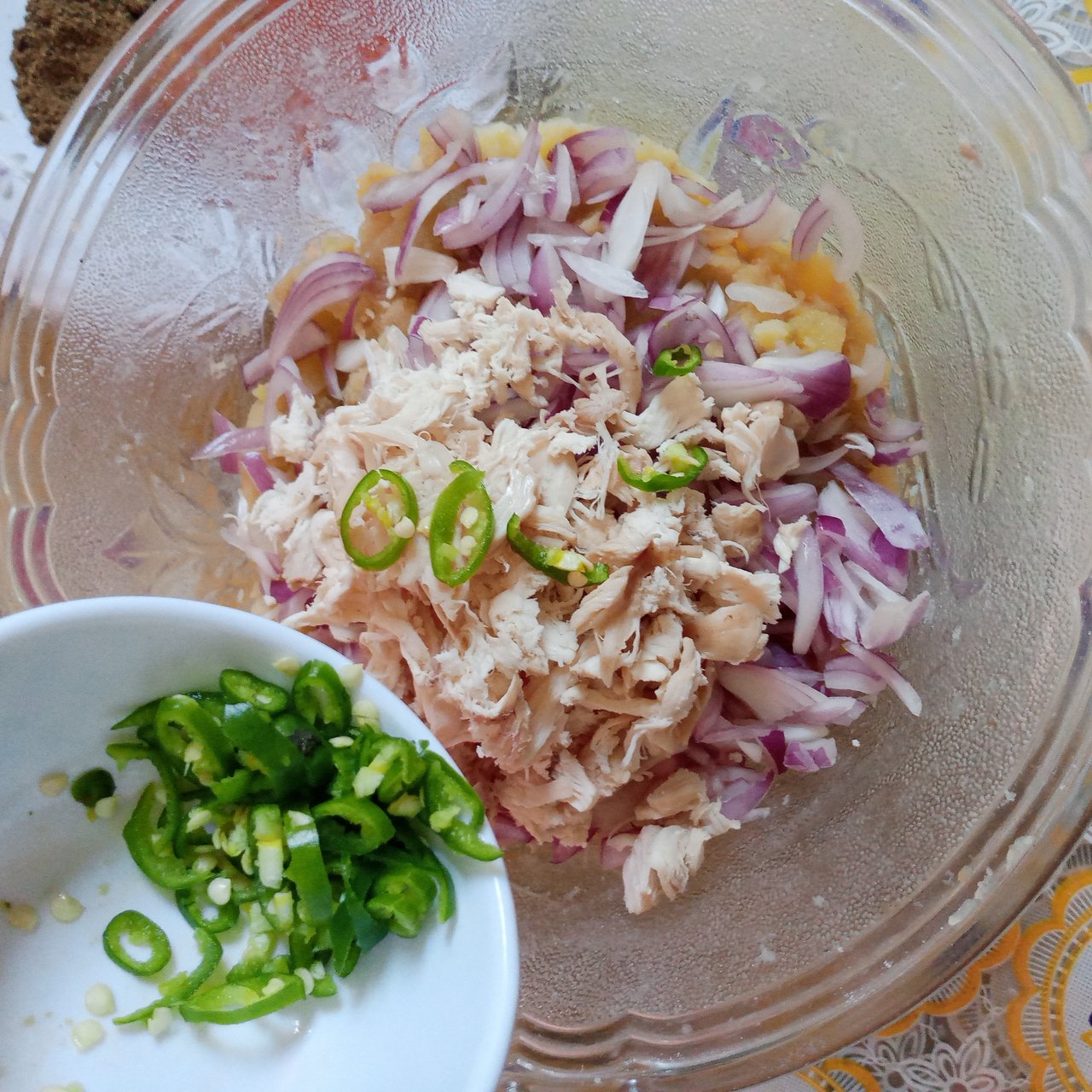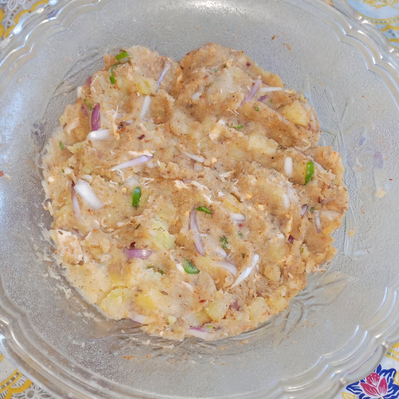 I had already boiled the potato and then I boiled the chicken and shredded it. I mashed the potato well with a masher. Then I started adding all the other ingredients to it.