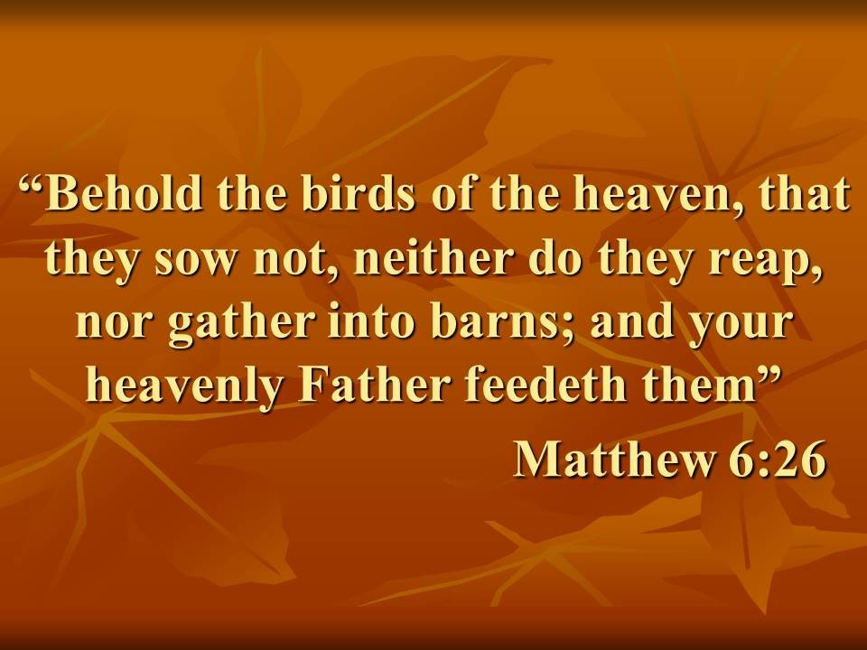 Behold the birds of the heaven, that they sow not, neither do they reap, nor gather into barns; and your heavenly Father feedeth them. Are you not much more valuable than they?" Matthew 6:25-26.