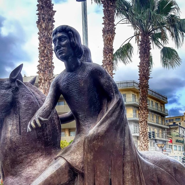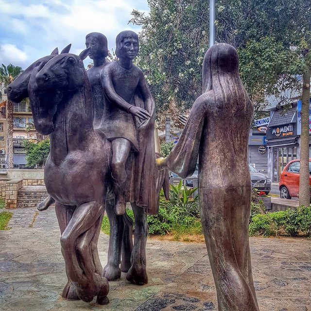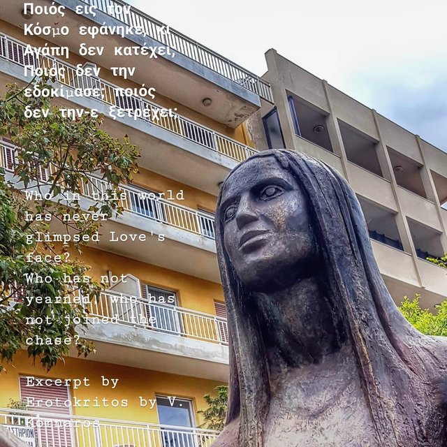 The statue that depicts Erotokritos saying good by to his loved one, is dominating the Kornarou Square and proudly stand for the past decades, providing an extra flair to an always busy street. --- Concluding with a note by thegreekvibe.com "The Greek Nobel laureate Seferis, said that true love, honor, friendship and courage - all praised in the verse of Erotokritos - have shaped the Greek character and “the fate of a nation. Always on the borderline of place and time, always preparing for a time of brilliance, always threatened by disaster…”." --- Artist of the sculpture: Yannis Parmakelis