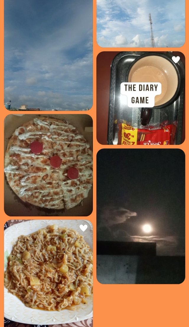 We ate the pizza after eating and at the same time my mother cooked home-cooked food. After giving and eating, we went up to the roof. There were very beautiful clouds and the moon was looking very beautiful. Then we walked on the roof and talked a lot.