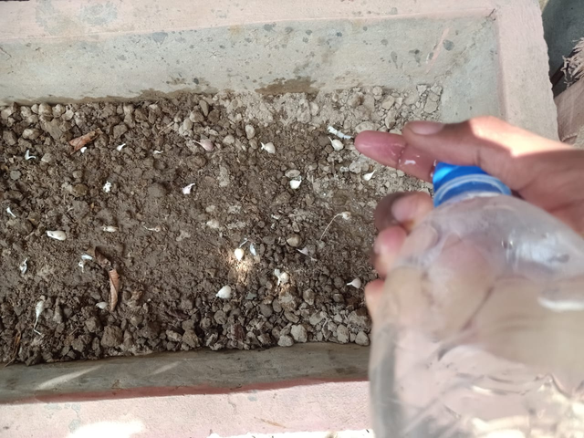 I took a Pepsi bottle, poured water into it, and closed the lid. After closing the lid, I opened it slightly so that a little water came out of it. With its help, I watered all the tubers. This kept the seeds in place and the soil moist. All the seeds got water and were saved from damage.