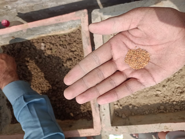There are two small beds left. Now I want to plant fenugreek and spinach in them. There is a separate space for both. In the first bed, I thought of planting spinach. I had already softened the soil. After softening the soil, I took the seed and planted it inside it with the help of pinchers.
