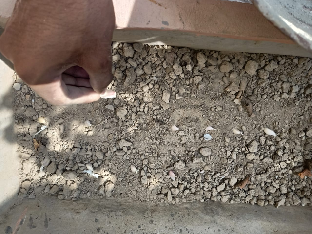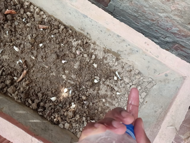 We had to plant garlic in a large pot. After softening the soil, we planted three rows of garlic, spacing them evenly so that if we had to replant them, it would be easy. We didn't plant it randomly, but in a certain order so that water could easily reach all the roots. At the same time, when we soften it, we would have space for it because later we would have to soften the soil and water it so that water could reach its roots.