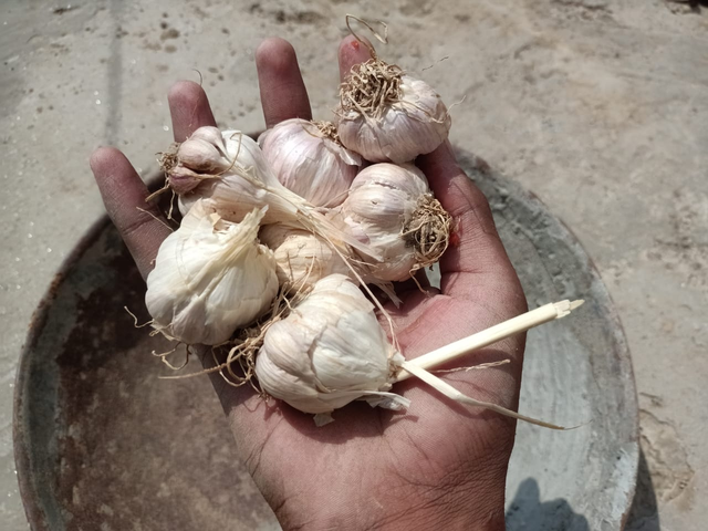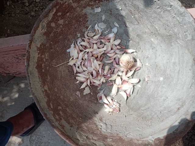 After softening the entire soil, the first thing to do is to plant the garlic. The garlic that we have at home, which we buy from the market, also works as a seed. So I took four pieces of garlic and separated them. After separating them, I cleaned them so that all the peels are separated, because the peels can also cause a slight obstacle in our production. So, grind them well. After grinding, separate their peels and use them as a seed.