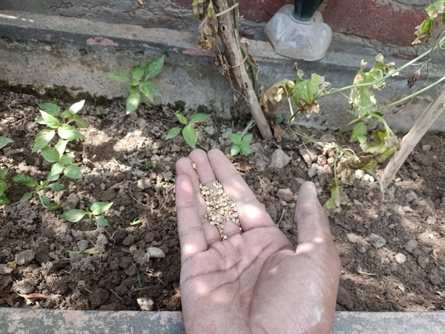 In the first big pot, I planted the garlic in a good way. Now let's move on to the second pot. In this, I have dry coriander seeds. I will plant that coriander here because we add coriander to every vegetable to garnish it. That is why it is very necessary, and that is why we also make chutney and eat it. We do this work in different places, so it is an important need of the house. Therefore, in the second pot, a chambel plant is planted on one side, on the other side of it, small chili plants are planted, and between them, I planted this coriander.