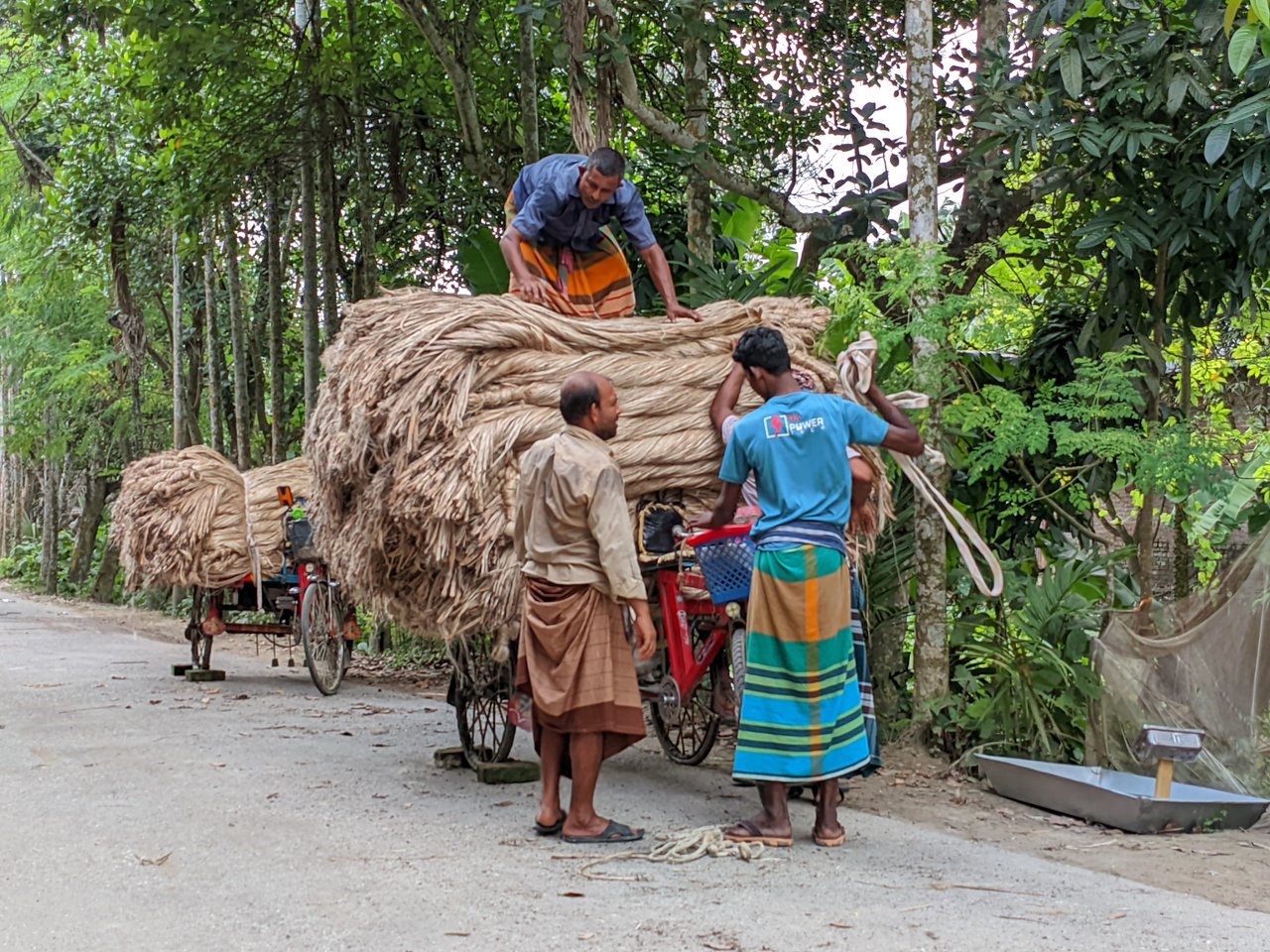 At this moment, a van came on the road with the jutes and saw them being arranged. I took a photograph of it. Then, I left the house to go to the salon for a haircut. I waited for a while, got on an easy bike, and then headed towards the market.