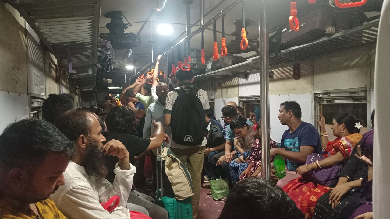 I will finish work with my friend and return home by the 7:20 train. I bid my friend a quick farewell and head to the station. Look, this station looks like the platform station of Narayanganj Railway Station. If someone suddenly sees it, it looks like a station outside the country. I got on the train with a ticket, and on the way there, I saw so many passengers; by the grace of God, I got a seat. However, I struggled a lot to get a seat. This is the view inside the train.