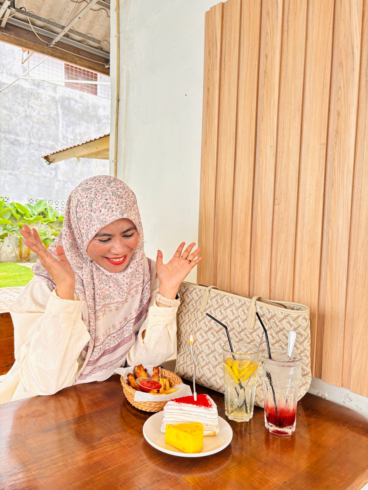 In the afternoon, I was invited to hang out at a cafe and it turned out that in that place, I got a birthday cake that was unk and adorable because in addition to its cute shape, it was also mini in size, equipped with a candle. I then blew out the candle. Then took pictures and videos for content. It was a very enjoyable afternoon especially since the food and vibes of the cafe were also very good and cosy. I thanked my eldest for preparing my special birthday treat today.