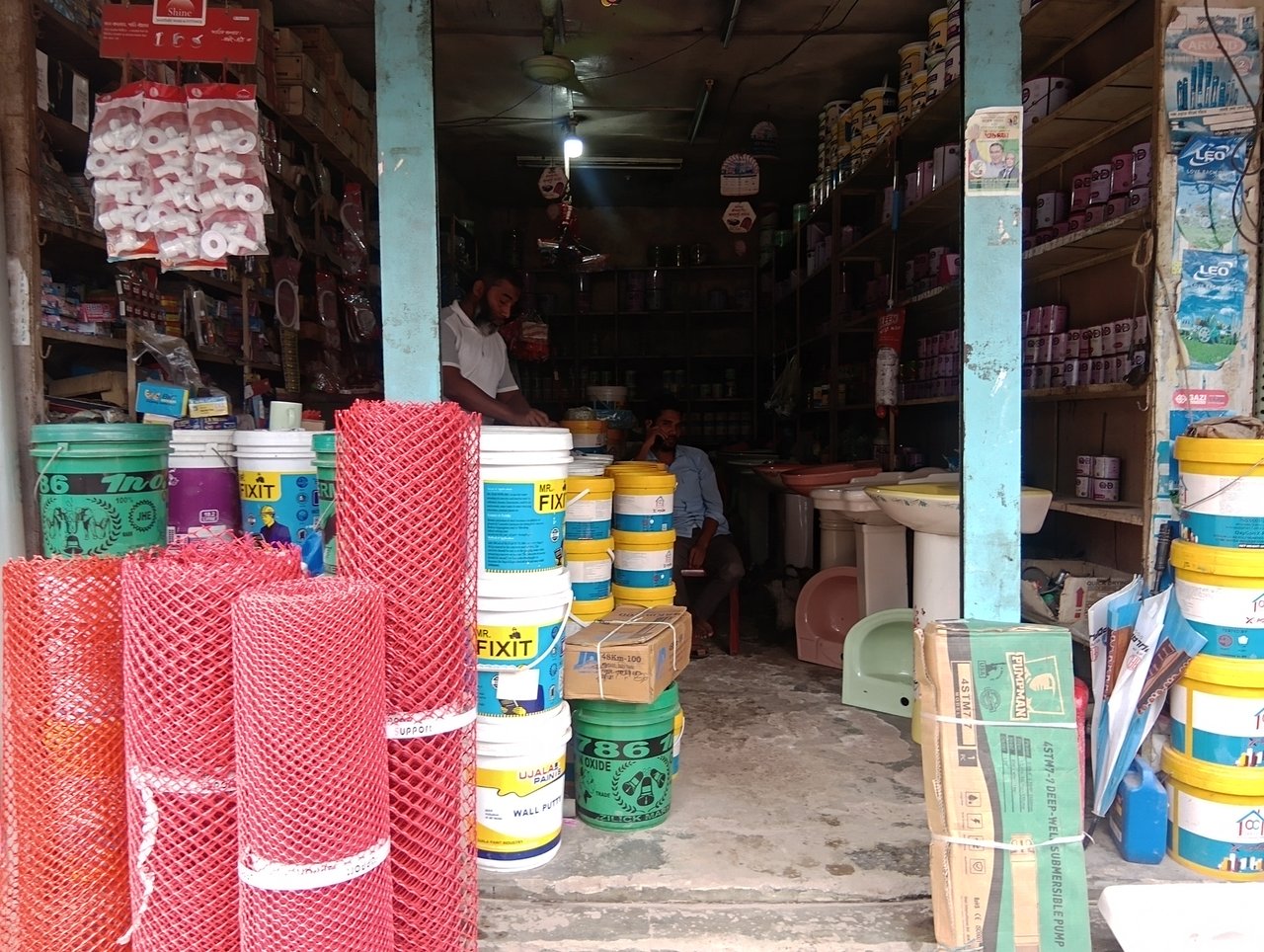 On the right side, I noticed paint cans and wash basins, while the left side had the shopkeeper’s counter and tools section. Behind the main area, there’s a small storage space where pipes and door fittings are kept.
