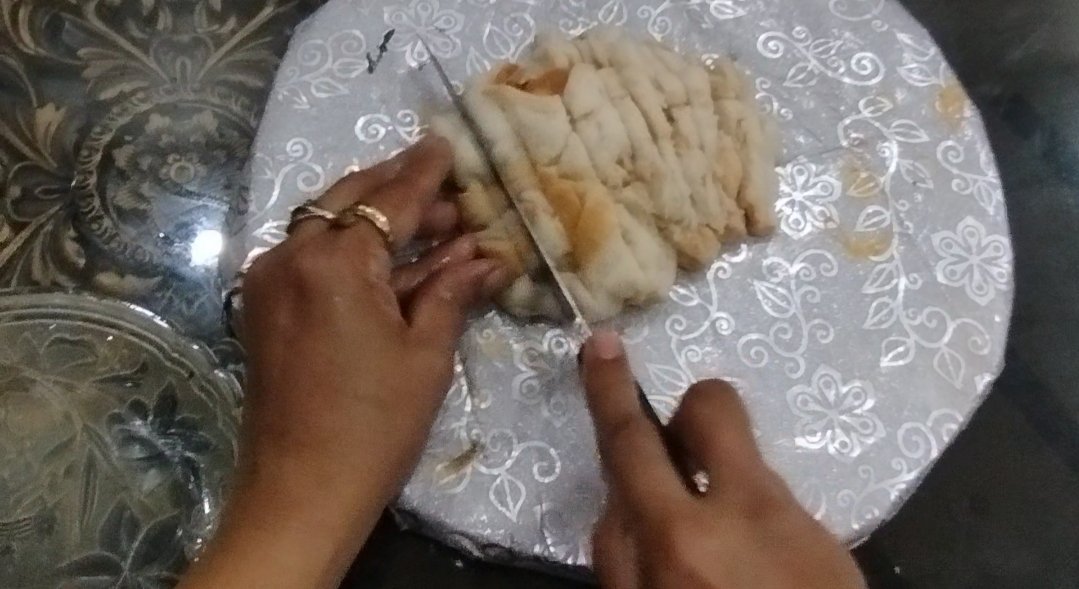 First I soaked the bread sliced in water then soaked chopped water and chopped finely from knife .