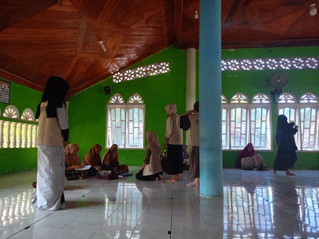 Kemudian setelah itu saya pun siap siap terus kami pun berangkat setelan menempuh perjalanan dengan jalan kaki rame rame akhirnya kami pun tiba di gerbang mesjid Ule nyeue kebetulan Halimah ada bawa tikar jadi kami pun ada tempat duduk kami pun duduk dengan leluasa di halaman mesjid acara pun sudah di mulai dari tadi, Tengku pun sudah naik di atas mimbar.