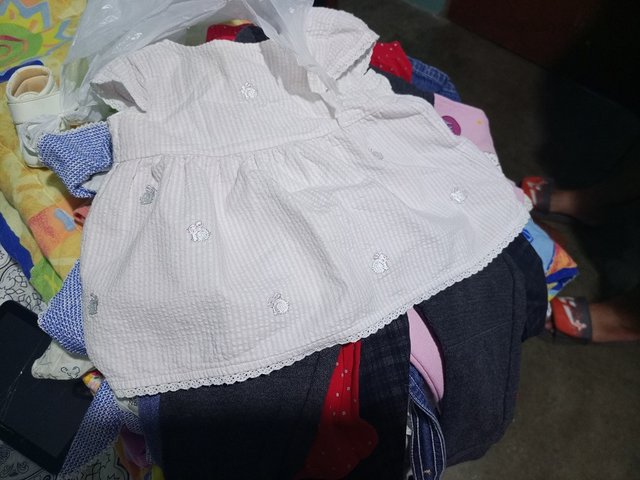 Mi pareja salió a montarle unas gomas al carro y regreso con una bolsa llena de ropa que le regalo una amiga para mi hija, sacamos todo y guardamos lo que todavía le queda grande. Voy hacerle unos lacitos para sus niñas como agradecimiento.