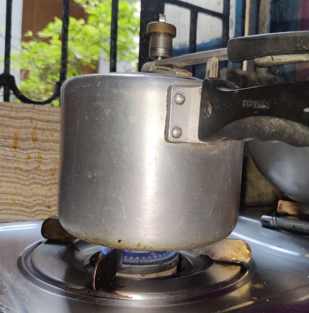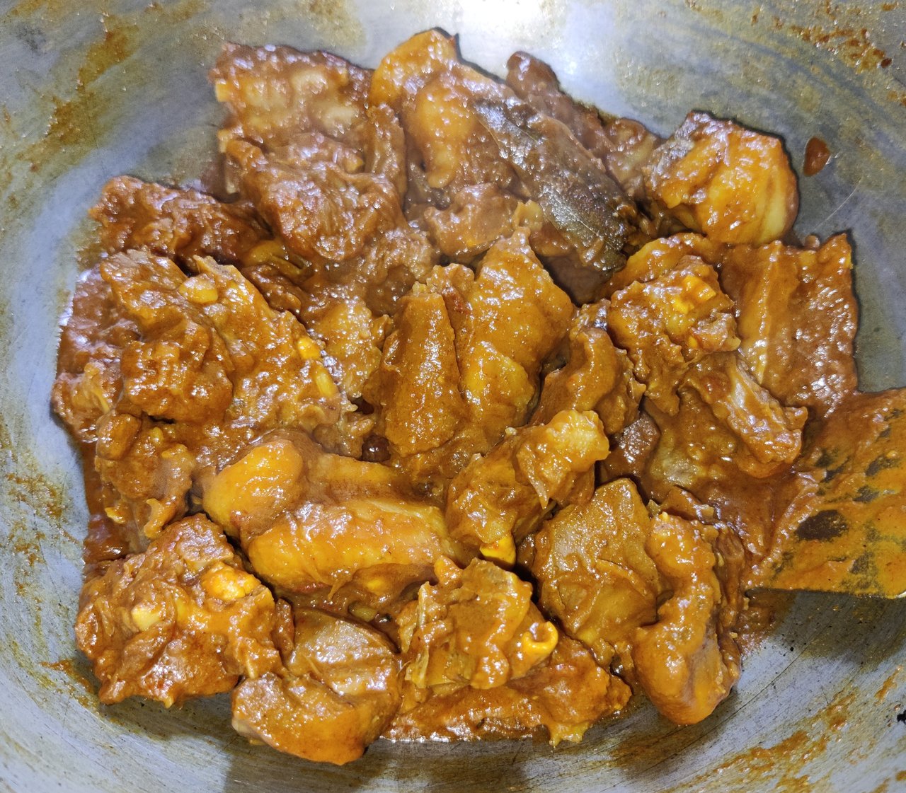 এরপর মাংসগুলোকে প্রেসার কুকার এর মধ্যে তুলে রাখলাম। কড়াইতে জল দিয়ে কড়াইতে থাকা মশলা গুলোর সাথে মিশিয়ে, জলটা হালকা গরম হলে প্রেশার কুকারে দিয়ে, ৪ টা হুইসেল দিয়ে একটু অপেক্ষা করলাম। প্রেসারের ভাব সরে গেলে আগে থেকে ভেজে রাখা আলু দিয়ে, আরও একটা হুইসেল দিলাম।