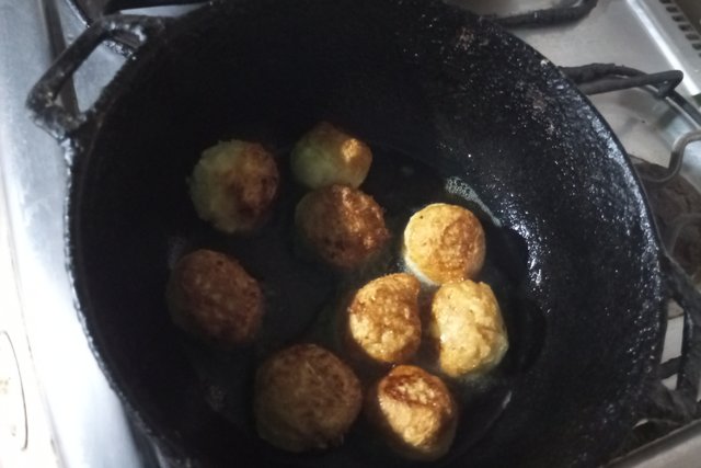En una sartén colocamos suficiente aceite y calentamos. Freímos los buñuelos hasta que estén dorados.