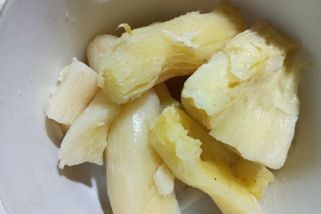 Pelamos la yuca, la lavamos muy bien y luego la cortamos en trozos pequeños; la llevamos a hervir hasta que ablanden.