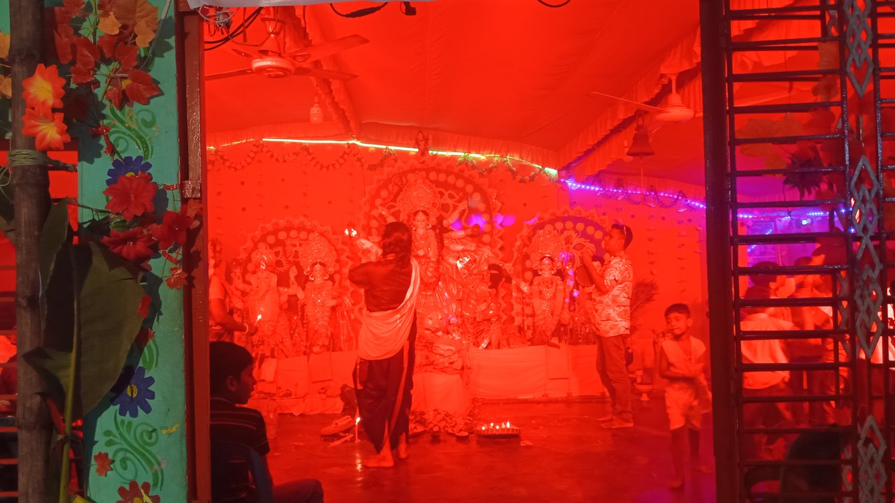 We had a special plan for today's puja; we would go for a walk with my friend's family. After the evening, we all got ready to go to Dhaka by train. But unfortunately, due to the busyness of my friend's shop, he couldn't go on time. So, I went out alone with my daughter today. Because my daughter is ready to go, she will be upset if I don't take her, so father and daughter went to see the puja. Today, I first went to the Nayamati temple adjacent to Pagla School; this temple is near our house. We walked to the temple. Here too, the puja has been beautifully arranged. We went to the mandap at a time when Thakur Mahasaya was performing aarti there. After a while, we went to another temple. After going there, I saw a man I knew. I had planned to visit a faraway place for worship today, but I had to go, so I saw our Elakar Puja Mandapas.