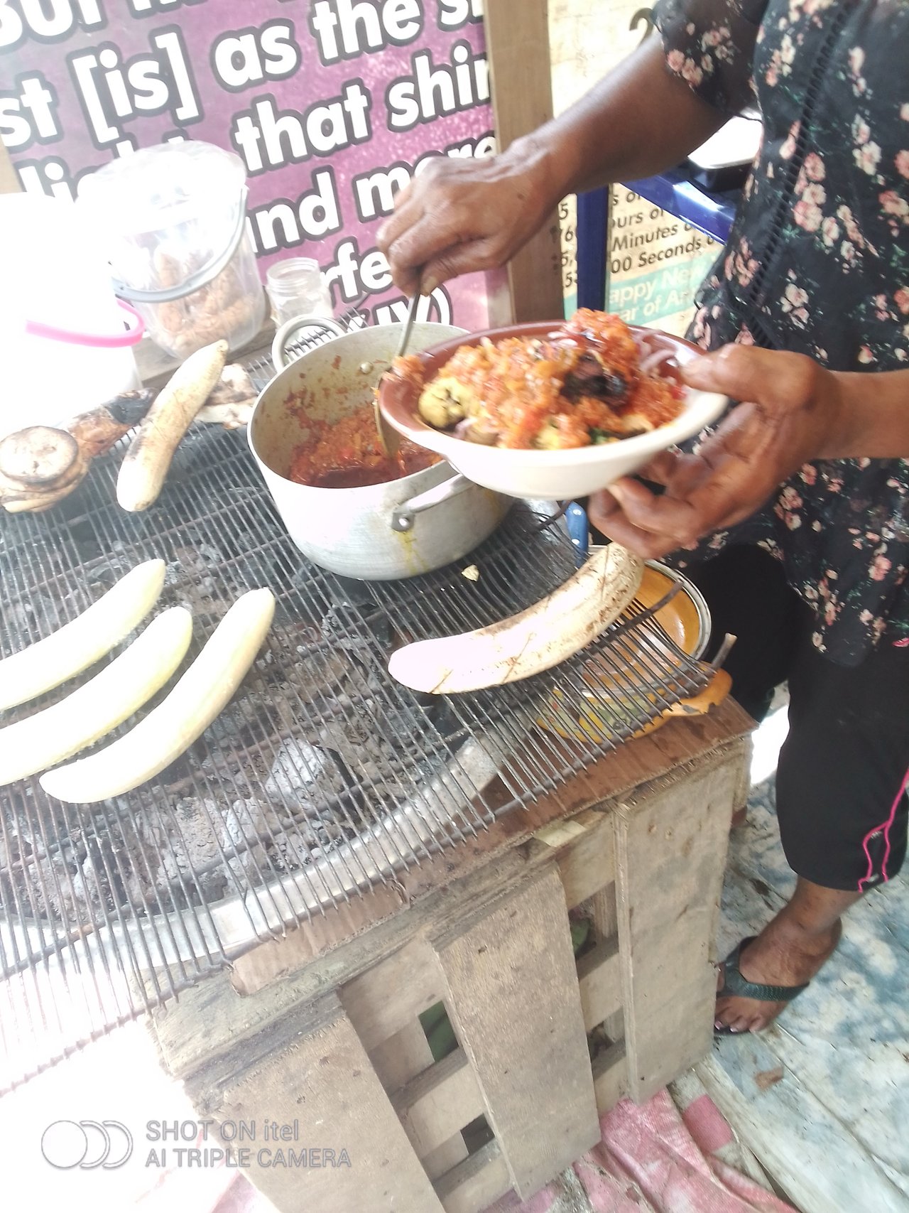 Next is the fish. You clean it properly, season it with salt, pepper, seasoning cubes, and maybe rub a little oil on it to help it roast nicely. If you like, you can stuff some onions or leaves inside the fish to boost the flavor. Then you grill or roast it too, side by side with the plantains, until it’s firm, crispy on the outside, and juicy inside.