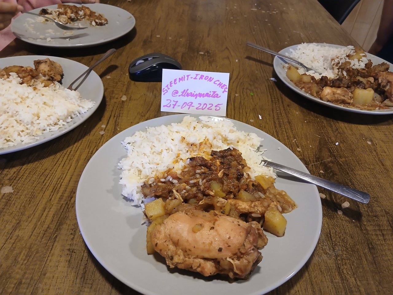 Todos en la mesa disfrutamos juntos y en armonía, un delicioso plato hecho por el padre de mis nietos, a él le gusta mucho cocinar arroz, me gana preparando un Delicioso Pollo guisado con papa, los condimentos esenciales que le agrega son pimienta negra y aceitunas negras bien picaditas, las cuales le otorgan un sabor extraordinario al pollo, también le deja suficiente salsa, lo cual hace un plato que los comensales, lo comamos todo, todito jejejeje.