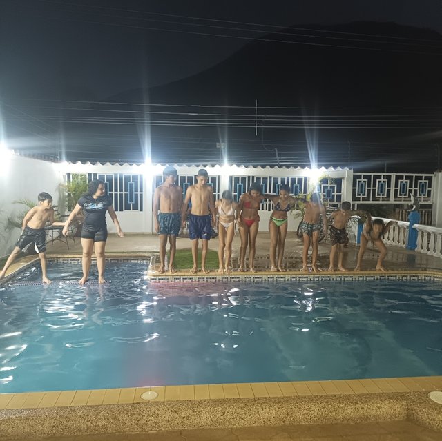 Cayó la noche y aún los niños se bañaban en la piscina , hicieron juegos, videos , competencia en fin buscaron la manera de alegrarse y disfrutar junto a la niña este momento!!