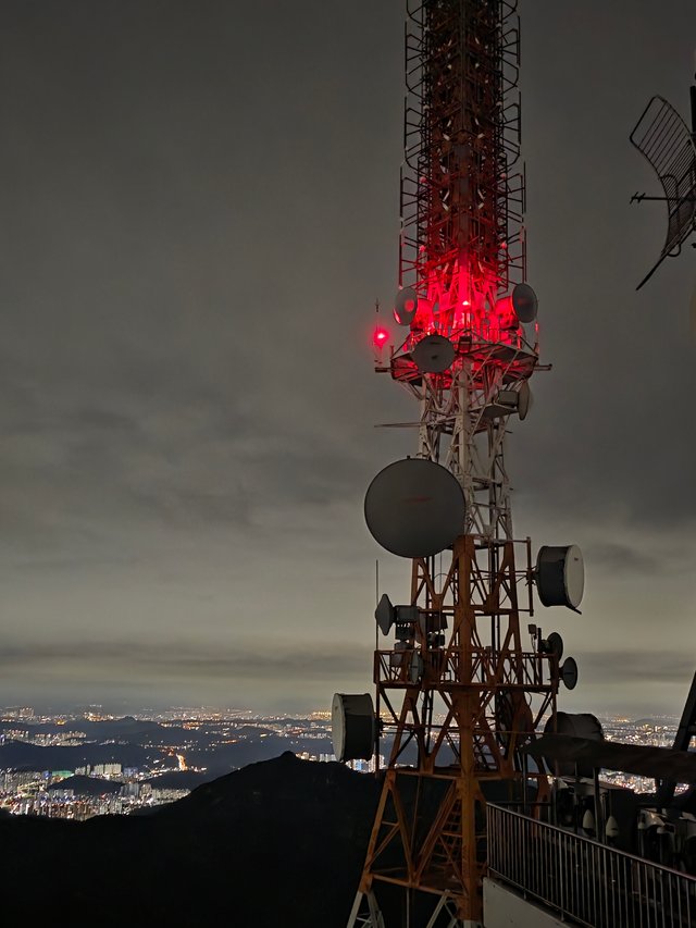 짙은 구름이 낮게 드리운 어두운 밤하늘 아래, 방송탑은 마치 도시를 지키는 거대한 파수꾼처럼 느껴지네요.