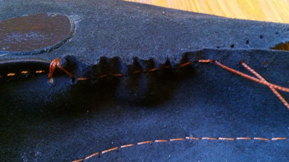 After we have prepared all the parts of the moccasins and tried the holes, we start assembling the shoes. First of all we sew the top to the bottom. If you have not guessed with the size, sewing a heel can be adjusted on a leg.