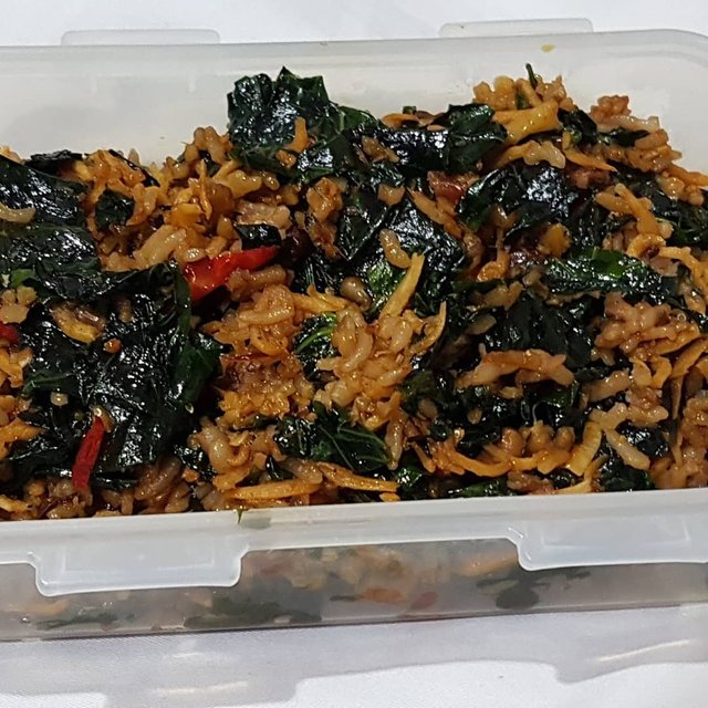 pic 1. Japanese cassava leaves, leftover spicy small dried anchovies and rice mix leftovers for today's lunch