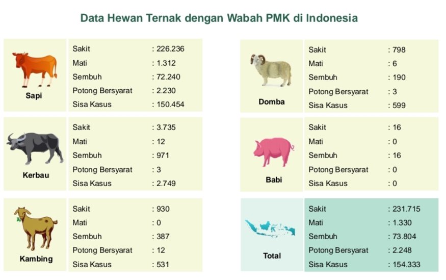 Saat ini kasus Penyakit Mulut dan Kuku (Foot and Mouth Disease) telah tertular di 19 Provinsi, 215 kabupaten/kota dengan jumlah hewan yang sakit banyak 231.715 ekor dan 73.804 ekor sembuh.
