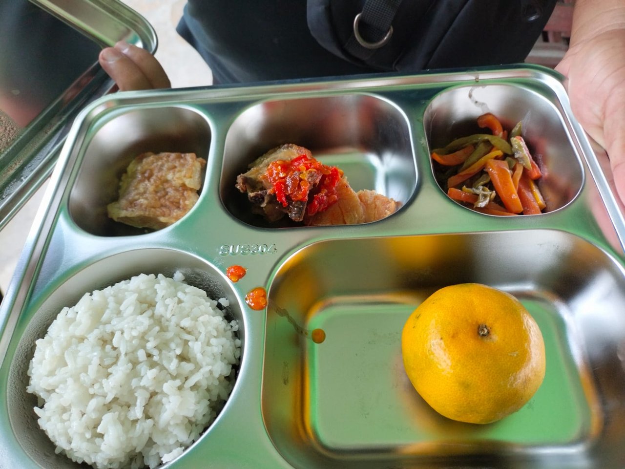 Ayam sambal segar serta sayur segar terlihat tersusun dengan rapi dan bersih, ditambah dengan tempe goreng serta buah jeruk yang cukup segar sebagai pencuci mulut. Sehingga kami berkesimpulan, menu serta penyajian Makan Bergizi Gratis di MIN 4 Kota Lhokseumawe di hari pertama terbilang sangat baik.